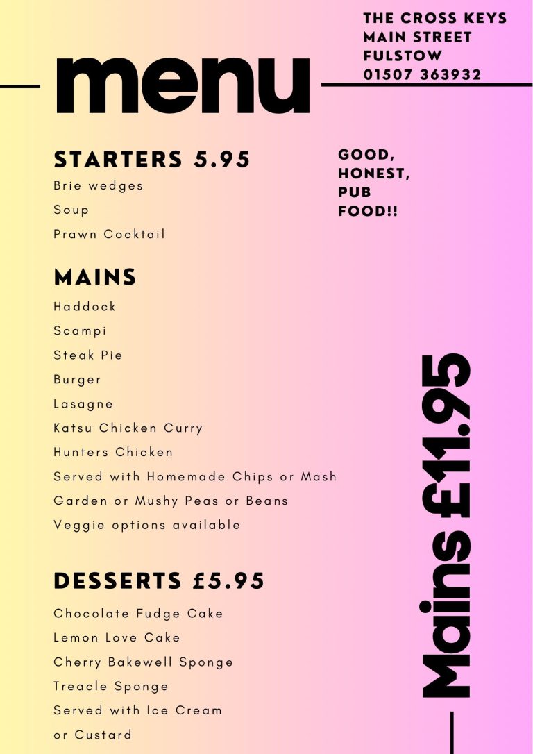 Nestled in the picturesque village of Fulstow, The Cross Keys offers a delightful spot for locals and visitors alike. Our pub is known for its cozy atmosphere and friendly service, creating the perfect backdrop for enjoying hearty meals and refreshing drinks.