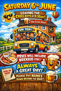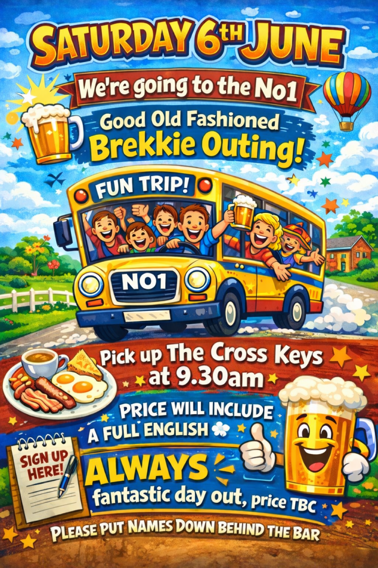 A FANTASTIC DSAY OUT TO THE NUMBER 1 PUB FOR A GOOD OLD FASHIONED BREKKIE OUTING. BUS PICKS UP FROM THE CROSS KEYS AT 9.30AM. THEN A SESSION AT THE NO1 THEN BACK.